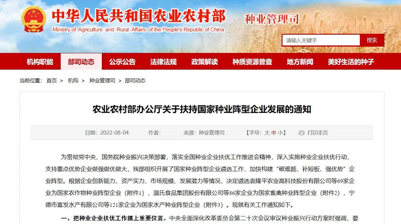 为贯彻党中央、国务院种业振兴决策部署,深入实施种业企业扶优行动,近日农业农村部办公厅印发《关于扶持国家种业阵型企业发展的通知》,根据企业规模、创新能力和发展潜力等关键指标,从全国3万余家种业企业中遴选了69家农作物、86家畜禽、121家水产种业企业机构,集中力量构建“破难题、补短板、强优势”国家种业企业阵型,加快打造种业振兴骨干力量。江苏省大华种业集团有限公司入选“国家农作物种业阵型企业·强优势阵型(小麦)”。扶持国家种业阵型企业发展是农业农村部为贯彻党中央、国务院种业振兴决策部署,落实全国种业企业扶优工作推进会精神,深入实施种业企业扶优行动,支持重点优势企业做强做优做大的重要举措,旨在加快构建“破难题、补短板、强优势”企业阵型。通知要求,要把种业企业扶优工作摆上重要位置,把阵型企业作为企业扶优的重点对象,把推进“三对接”(科研单位与阵型企业对接、金融机构与阵型企业对接、种业基地与阵型企业对接)作为企业扶优的重要平台,把创设扶持政策作为企业扶优的重要手段,把净化发展环境作为企业扶优的重要保障,把构建亲清政商关系作为企业扶优工作的重要要求。近年来,江苏省大华种业集团有限公司聚焦核心主业,