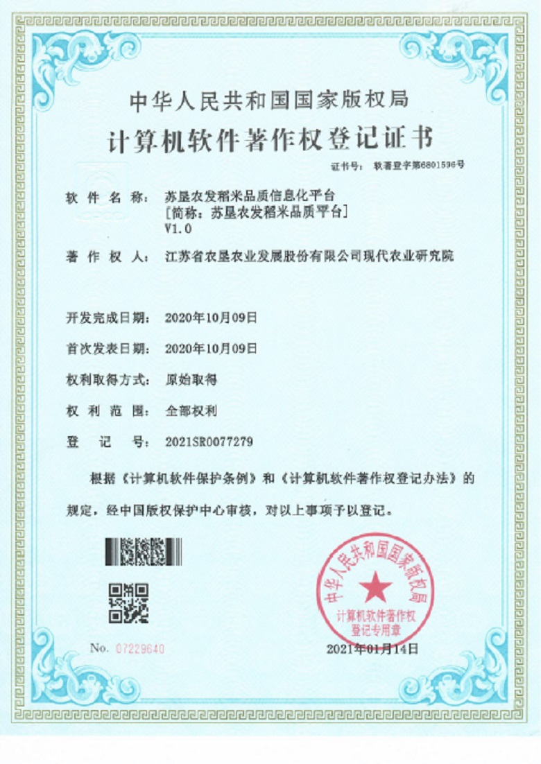 2021年1月,苏垦农科院成功获得《m88asia稻米品质信息化平台》(登记号:2021SR0077279)国家版权局颁发的计算机软件著作权登记证书,这标志着m88asia稻米品质评价体系经过近三年的科学研究和技术攻关,取得了阶段性的成果。