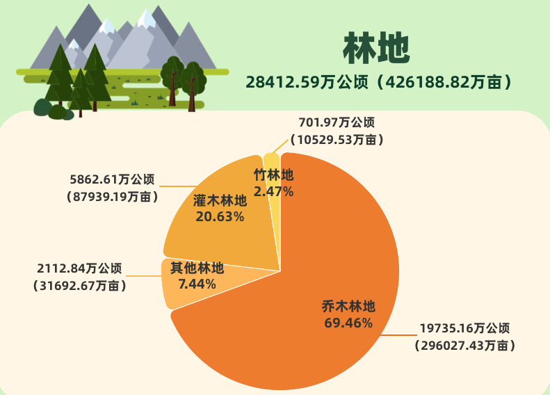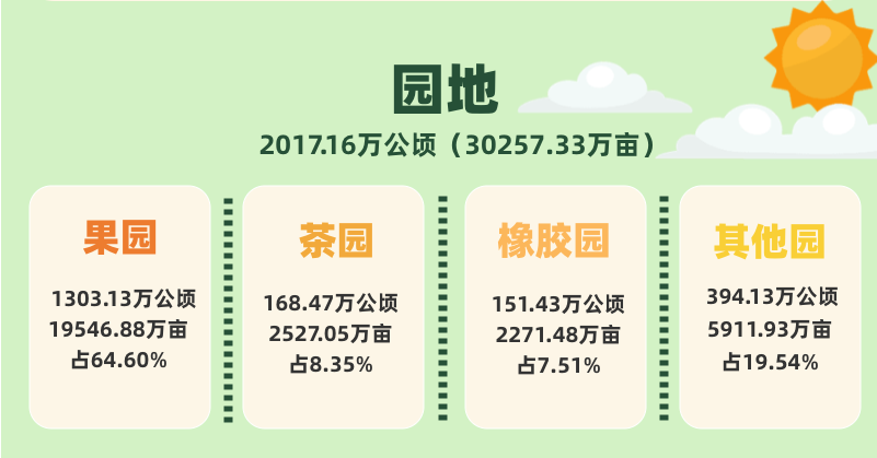 《公报》还显示:我国园地面积3.03亿亩。其中果园1.95亿亩,占64.60%;茶园0.25亿亩,占8.35%。草地39.68亿亩。其中天然牧草地31.98亿亩,占80.59%;人工牧草地0.09亿亩,占0.22%。林地42.62亿亩。湿地3.52亿亩。城镇村及工矿用地5.3亿亩。其中村庄用地3.29亿亩,占62.13%。交通运输用地1.43亿亩。其中农村道路0.71亿亩,占49.88%。水域及水利设施用地5.44亿亩。其中水库水面0.51亿亩,占9.28%;坑塘水面0.96亿亩,占17.69%;沟渠0.53亿亩,占9.69%