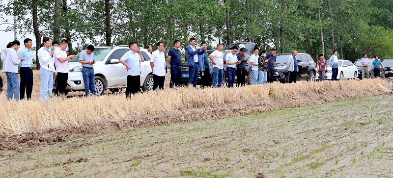与会人员先后观摩了黄海分公司玉米大豆带状复合种植播种、出苗现场以及水稻栽插现场,听取有关情况介绍。