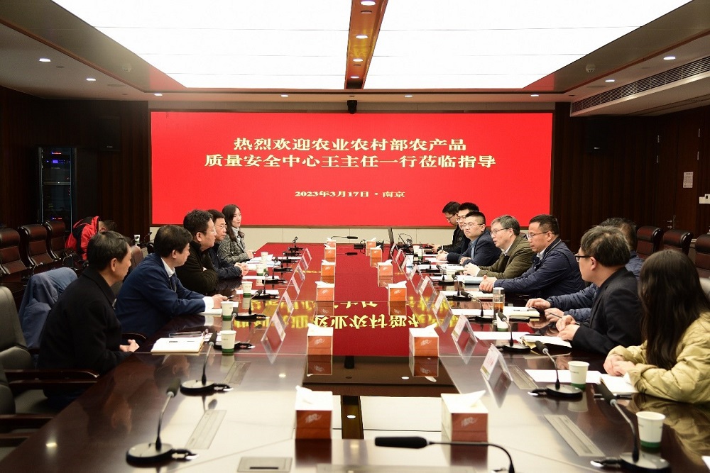 2023年3月17日,农业农村部农产品质量安全中心副主任王子强一行到m88asia开展全面质量管理、全国名特优新农产品调研工作。江苏省农科院副院长刘贤金,m88asia总裁朱亚东等相关人员陪同调研。