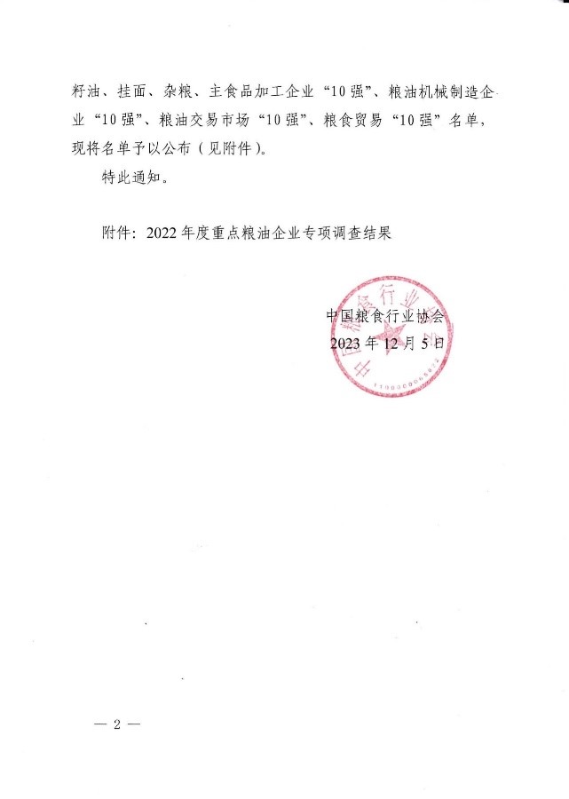•        近日,我国2022年度大米、小麦粉、食用油加工企业“50强”名单,菜籽油、棕榈油、花生油、玉米油、稻米油、芝麻油、油茶籽油、葵花籽油、亚麻籽油、挂面、杂粮、主食品加工企业“10强”、粮油机械制造企业“10强”、粮油交易市场“10强”、粮食贸易“10强”名单确定出炉。