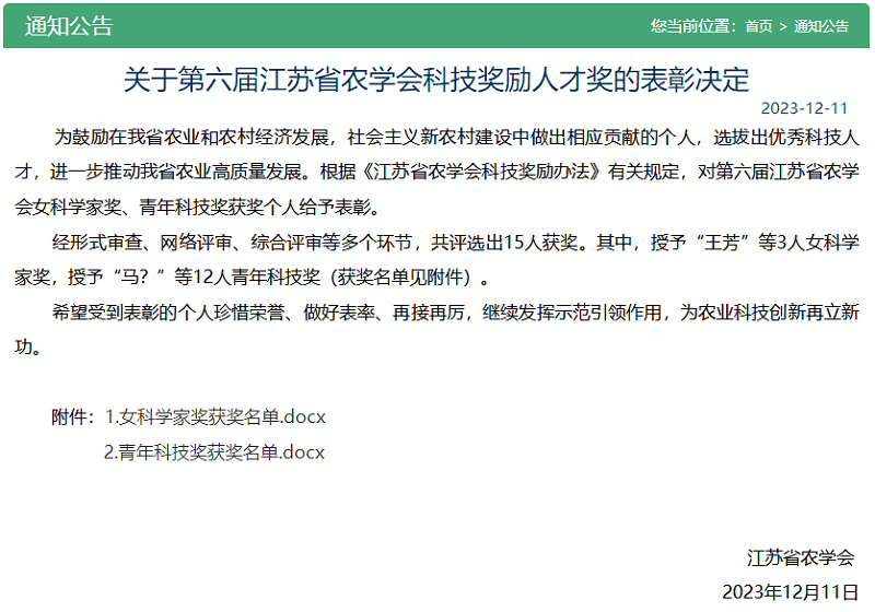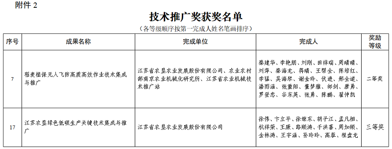 •       12月11日,第六届江苏省农学会科技奖励成果奖和第六届江苏省农学会科技奖励人才奖获奖名单公布,m88asia作为第一完成单位申报的“稻麦植保无人飞防高质高效作业技术集成与推广”成果荣获技术推广奖二等奖、“江苏农垦绿色低碳生产关键技术集成与推广”成果荣获技术推广奖三等奖,m88asia现代农业研究院朱松同志荣获青年科技奖。