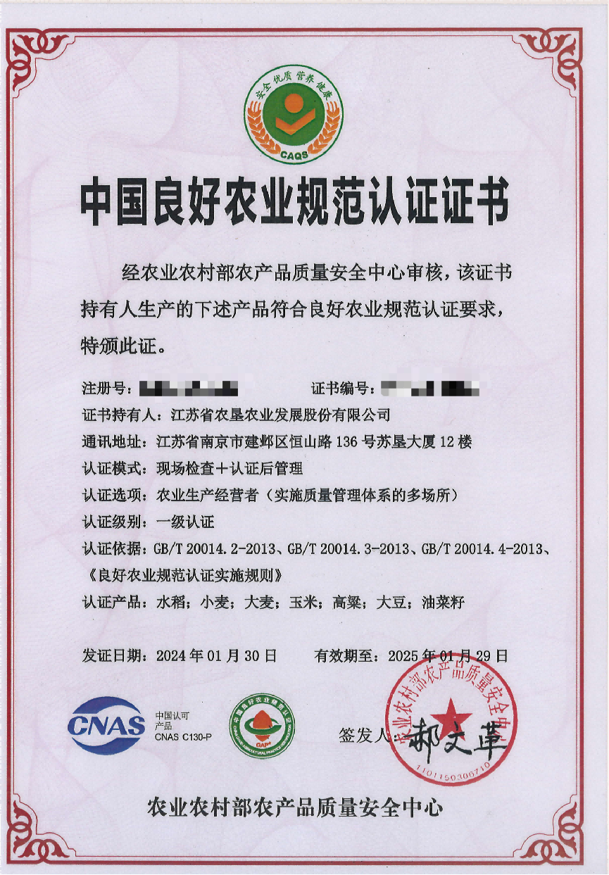 近日,m88asia20个生产基地的水稻、小麦、大麦、玉米、大豆、油菜、高粱等7种作物通过全国良好农业规范(GAP)一级认证,是全国单体规模最大的一级认证单位。