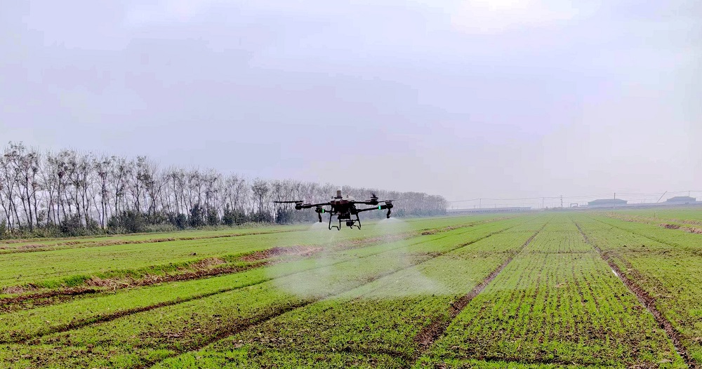 在东陬生产区,绿油油的麦苗长势喜人,植保无人机在操作人员的控制下,按照设定好的航线来回穿梭,均匀地将药液喷洒下去。“现在无人机打药用水量3.5L,不仅打的透,不重不漏,而且能够精确控制药量,减少农药浪费,达到节本增效的目标,作业效果非常好。”生产区技术员乔文忠介绍说。