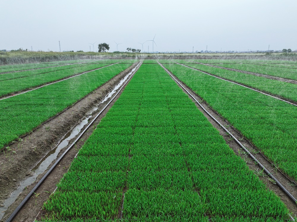端午时节,m88asia东辛分公司托管基地的水稻秧田生机勃勃。今年,托管基地1.2万亩水稻全部推广微喷灌育秧技术,实现技术全覆盖,标志着传统水稻育秧向节水高效模式的跨越。